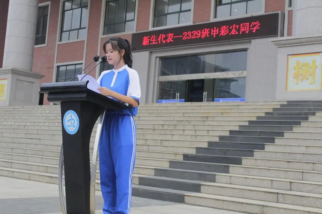 在师生代表发言环节,2329班幼儿保育专业的申彩宏同学代表1770名新生提前为全体教师送上教师节祝福,她表示要做“有信仰,守纪律,重责任”的中职生,记住“笃勤致能,搏行励新”的校训,并时刻用它来鞭策自己,让校训成为指路明灯。