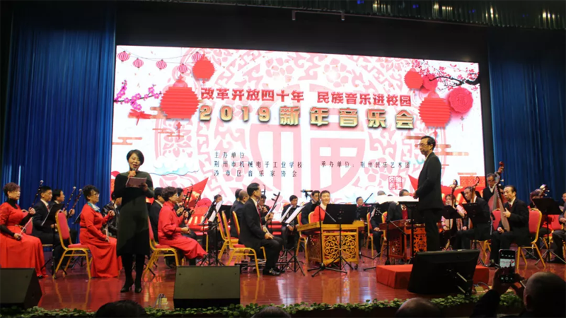 活动当天,荆州电校在科技楼三楼报告厅举行了改革开放四十年民族音乐进校园、迎新年音乐会,特邀荆州民乐团前来演出。