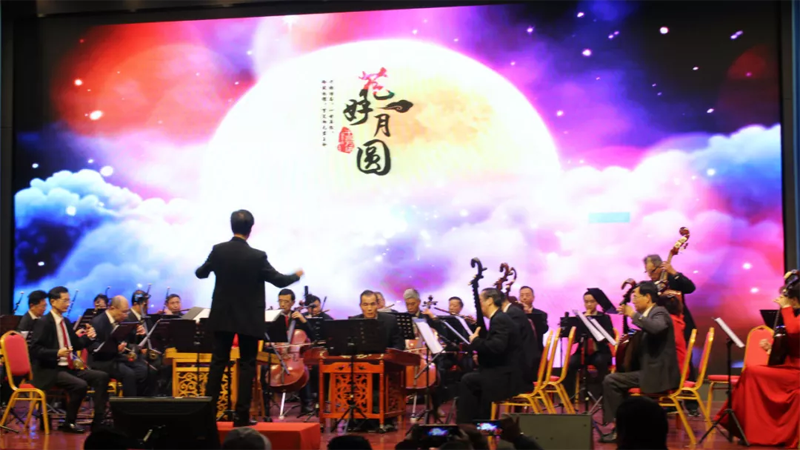 荆州民乐团带来的开场曲《花好月圆》。该曲由音乐指挥家黄贻钧所创作,后经中央广播民族乐团演奏,影响甚广。一曲完毕,现场响起了热烈的掌声。
