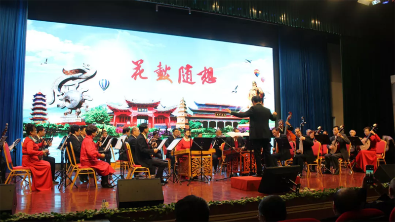 荆州民乐团接着演奏了自创曲目《花鼓随想》。该曲根据荆州花鼓戏的曲牌唱腔为体裁,从而改编,音乐节奏时而欢快激昂,时而悠扬舒缓,使听曲者的心都跟着音乐节奏一起律动,深深融入到音乐里。