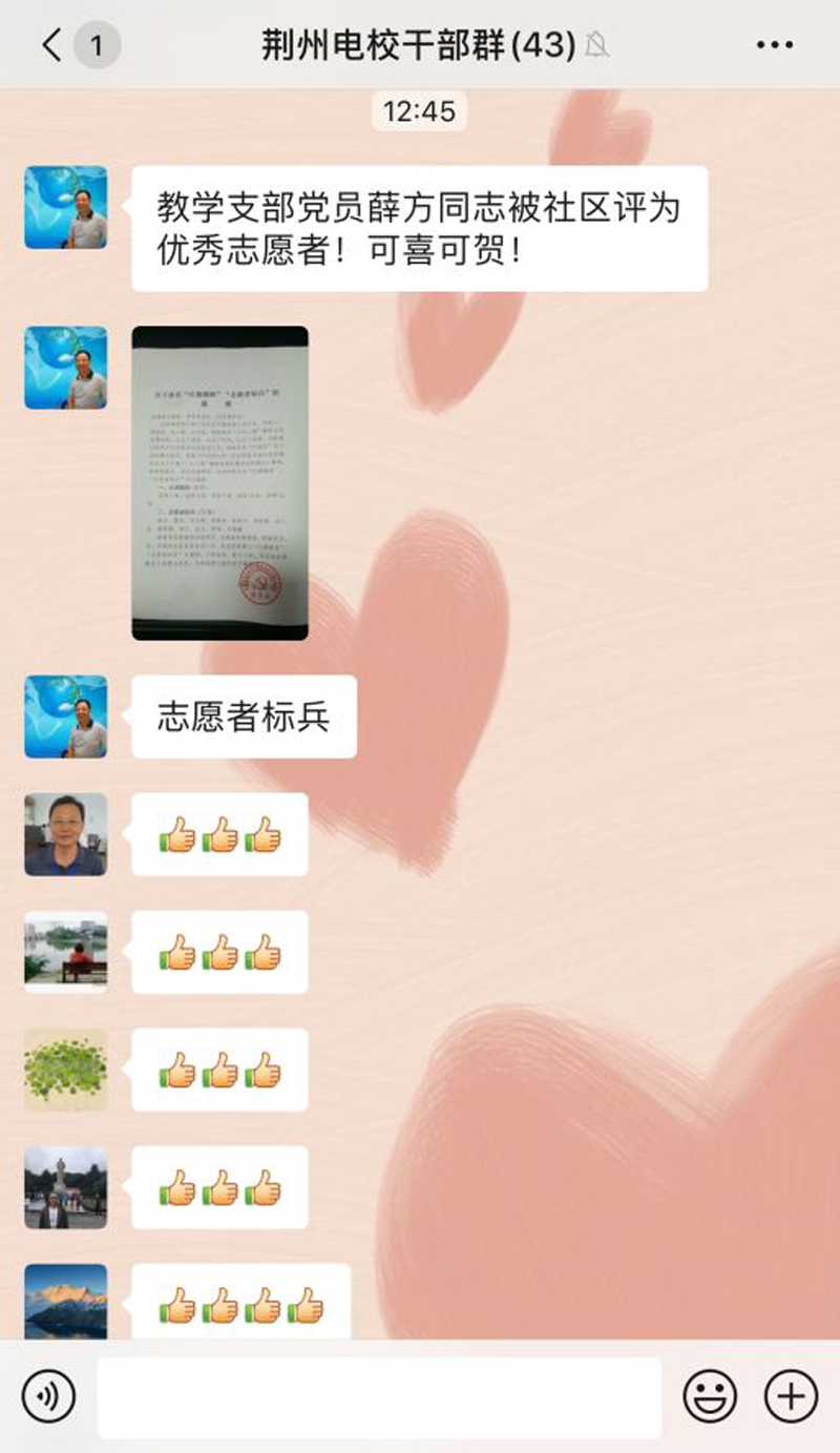 疫情无情,人有情。疫情发生以后,荆州市机械电子工业学校党委迅速成立工作专班,切实做好校内疫情防控、学生网络教学和开发区复工企业职工集中住宿服务工作,同时,学校党委还号召全校党员干部迅速向住所在地社区(村委会)报到,积极参与住所地疫情防控工作。教务科副科长薛方就是最早响应号召,参与社区疫情防控工作中的一员。