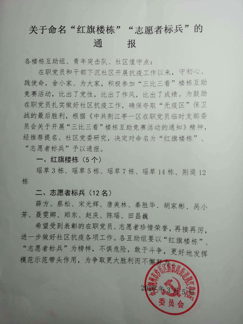作为荆江亭社区一片区临时党支部的支部委员,薛方同志积极发挥带头作用,坚决贯彻落实市委各项工作部署要求,在社区开展的“三比三看”楼栋互助竞赛活动中,用共产党员的铮铮誓言和铁肩担当为社区防疫工作作出了应有贡献。截止目前,薛方下沉服务的荆江亭社区一片区无一人感染、无一人疑似。3月5日,沙市区解放路街道荆江亭社区授予薛芳同志“志愿者标兵”荣誉称号。