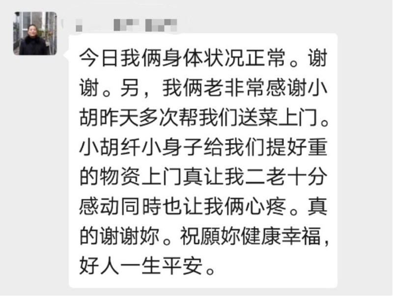 3月6日一早,一条特殊的感谢信也通过微信传到了她的手机里。致谢者是一位81岁的老人,他对胡蓉蓉在抗疫期间给予他和他老伴的帮助,表达由衷的谢意。