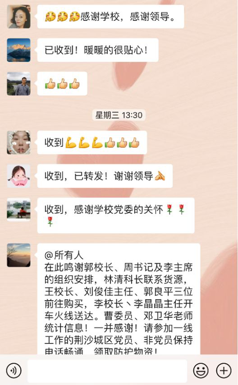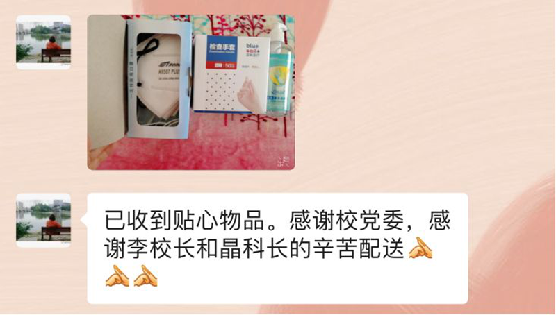 学校党委考虑到大家值守一线防护物资消耗量大,特意组织安排购买了一批防护物资,分批次送到中心城区值守一线的老师们手中。