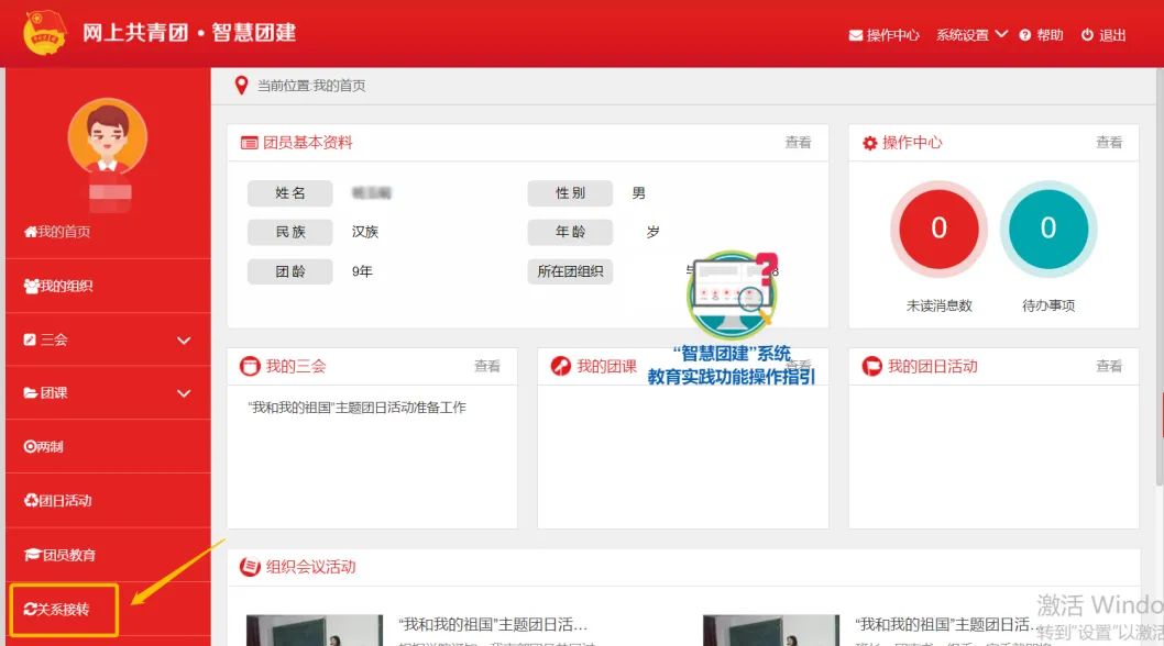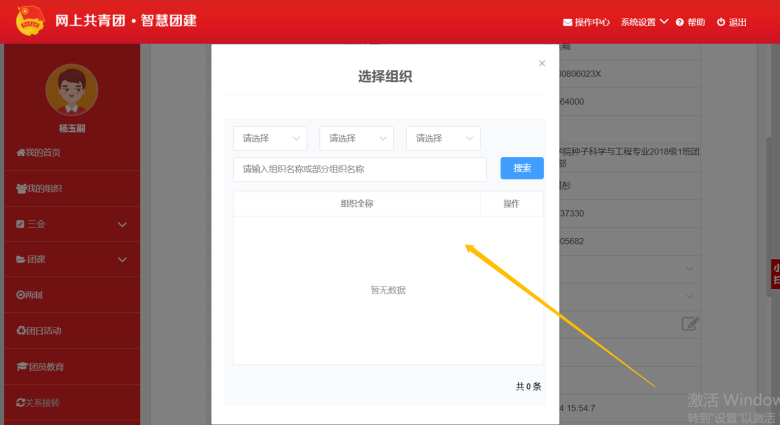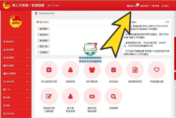 (1)同上述流程进入智慧团建系统,点击右上角“操作中心”,查看团组织信息。