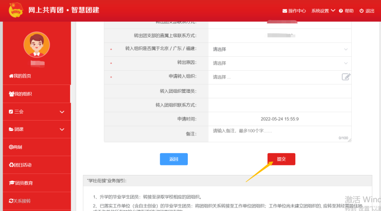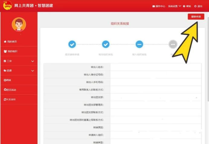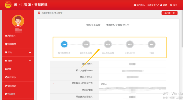 【注】若显示身份证或密码错误,请联系校团委管理员确定本人是否已录入“智慧团建”系统。若确认在系统内,可点击[忘记密码]进行修改,并联系本级团支部管理员或校团委管理员生成[重置密码验证码]。 (2)进入个人中心,在左侧菜单点击“关系转接”按钮。 (3)进入此界面后,务必填好全部信息,部分个人信息系统已生成,必填常用联系人联系方式(填写自己)、转入组织是否为北京/广东/福建(一般填写“否”特殊情况根据个人情况填写)、转出原因(升学)和申请转入组织(录取院校)。 【注】请务必根据实际原因,选择正确的转入组织: ①若原因为升学,转出组织为录取学校团组织。 ②若原因为参军入伍等涉密情况,由省级单位审核,转出组织为特殊单位专属库。 ③若原因为未落实学习、工作单位,转出组织为团员本人居住地、户籍所在地或生源地的乡镇街道“流动团员团支部”。 普通高校和职业教育学校的毕业学生团员在毕业后尚未落实就业去向的,可在原就读学校保留团组织关系不超过6个月。 (4)确定信息无误后即可提交。 (5)申请成功后可通过此界面看到申请进度,若有问题请及时联系校团委或者转入院校。 (6)如果信息填入错误,在审批未成功前可提交“撤回申请”。